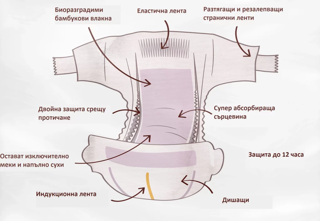 Новите бебешки пелени са направени от бамбук, което ги прави меки като бельо. Външната част на пелената е от 100% тъкан бамбук (биоразградим) и гладък филм от царевично нишесте (биоразградим). Вътрешната част е комбинация от бамбукови нишки (биоразградими) и мембрана, която вкарва влагата навътре в пелената, за да пази бебешкото дупе сухо (не е биоразградима). Пълнежът е от биоразградима дървесна целулоза и супер-абсорбиращ Японски полимер (не е биоразградим). С тази иновативна попиваща технология и ушивка, новите бамбукови пелени запазват кожата винаги суха и дишаща свободно.