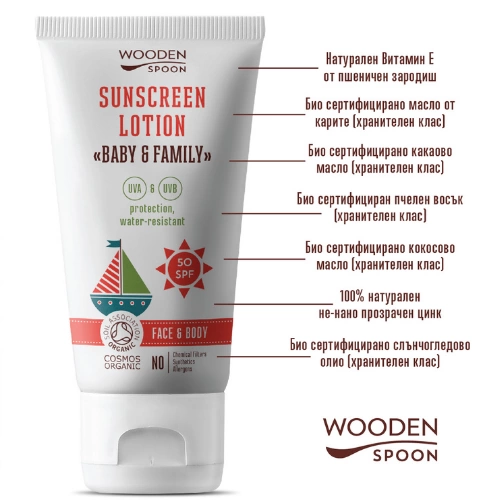 Всички слънцезащитни лосиони на Wooden Spoon съдържат 100% натурални съставки. Иновативният прозрачен цинк, който използваме сега в нашата слънцезащитна серия, както и обикновеният цинк, който използвахме до миналата година са не-нано! Всички слънцезащитни продукти са био сертифицирани по COSMOS Organic.